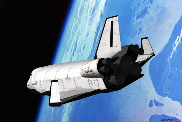 シャトル本体のデザインはその延長上にあるため、シルエットの基本形はそれほど変化していない、フェイズBの流れをくむ完全リサイクルオービターで宇宙に打ち出される